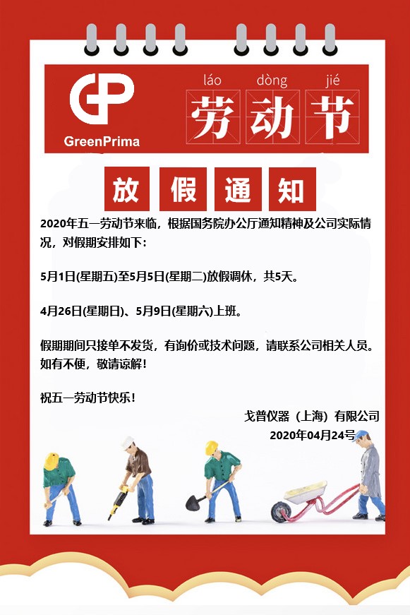 2020年五一勞動節來臨,根據國家對法定節假日的安排,戈普公司于5月1日放假至5月5日,共五天,5月9日(星期六)正常上班。假期期間倉庫不發貨,有詢價或儀表安裝,操作等技術問題的,請直接撥打相關人員移動電話。